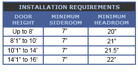 Should I use my rough opening or finished opening when I measure? Measure your rough opening, the door will be custom made bigger to overlap your frame and your guiderails will mount on the face of your frame. That is why your need the headroom and sideroom requirements. The Model 650 at the selected height will require 15 1/2 inches of headroom above the opening and 4 inches of sideroom to either side for installation.